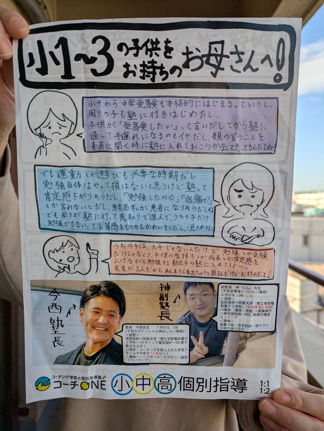 彼女のいうとおり、ヘタウマな感じが強烈に目を引く素晴らしいチラシだと思います。塾の先生の熱心さや温もりがチラシから伝わってくるような気がします。