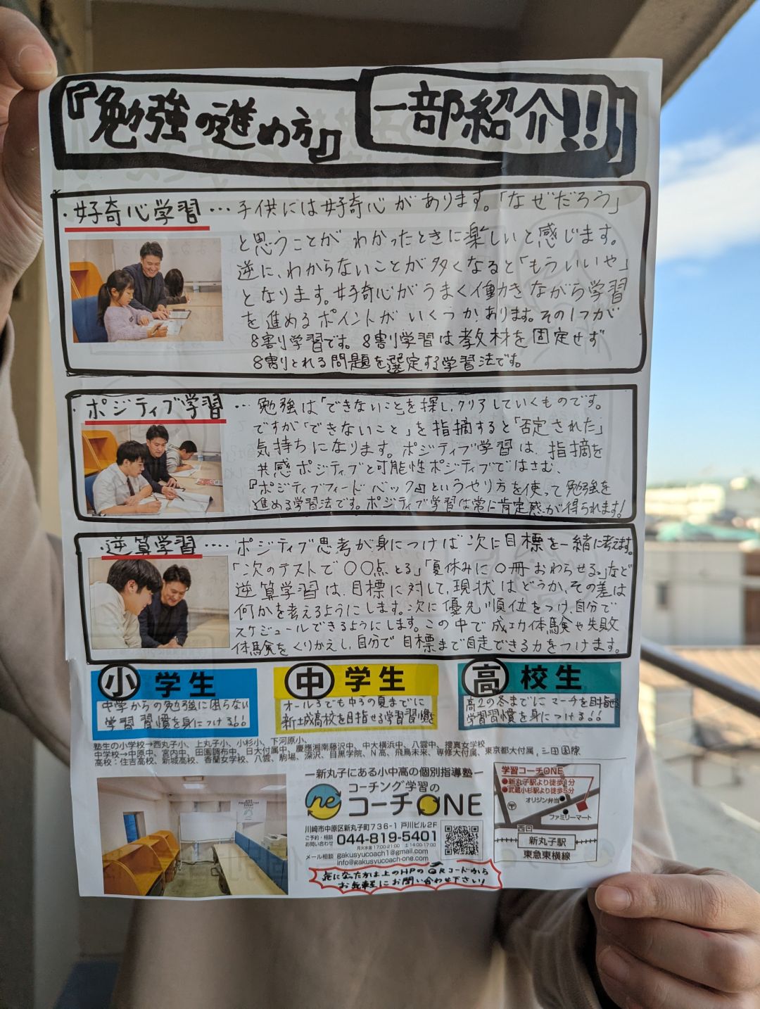 当社スタッフの自宅ポストに入っていた塾の手書きチラシです。「よくできた手書きのチラシが入ってました~。参考になるかと思って」と会社に持ってきてくれたのです(真面目なスタッフに恵まれてしあわせです)。