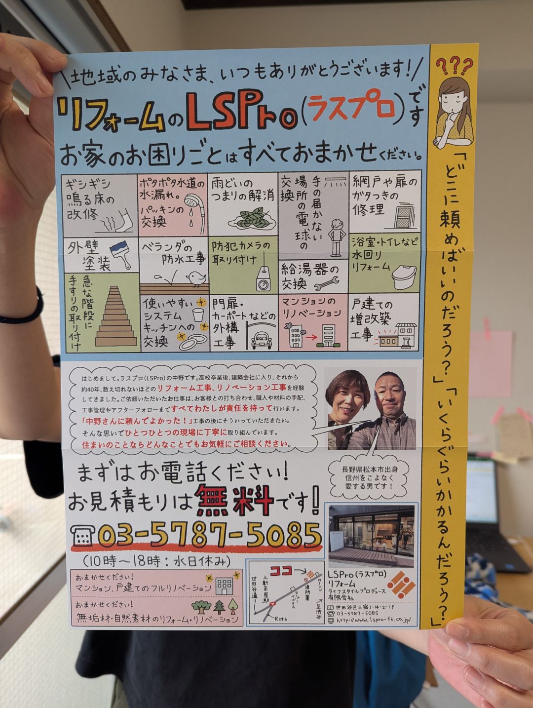 下の画像は世田谷区にあるリフォーム会社、ラスプロ(ライフスタイルプロデュース)さんの手書きチラシです。リフォームメニューをイラストで紹介しつつ、スタッフの顔写真も載せた、見ただけで安心感が伝わるあたたかい雰囲気のチラシです。手に取ったお客様が「相談してみようかな」と思えるような、やさしさと信頼感が同居したデザインになっています。